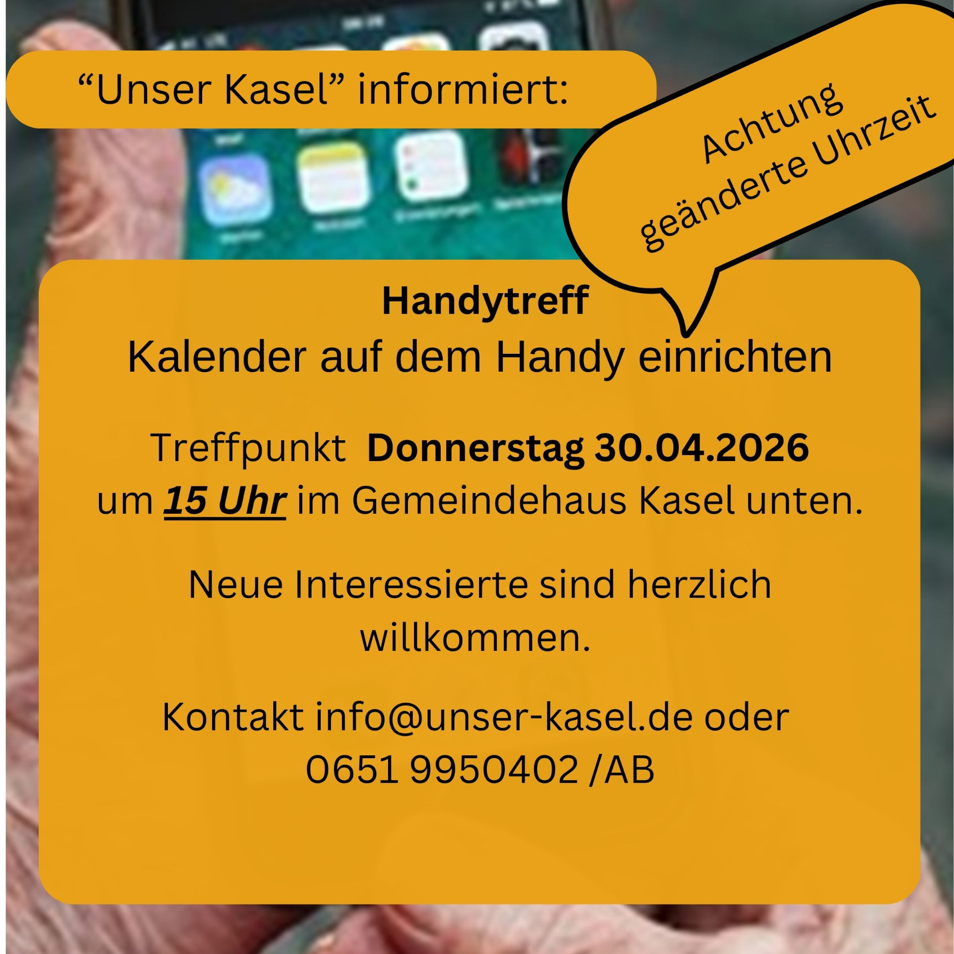 Die Termine und Themen werden im Amtsblatt und im Terminkalender der Gemeinde www.kasel.de veröffentlicht.